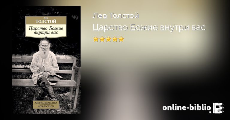 «Царство Божие внутри вас» – религиозно-философский трактат Л. Н. Толстого, написанный им в 1890–1893 годах, одно из ключевых произведений для понимания его позиции «непротивления». Пережив в конце 1870-х годов мучительный духовный кризис, пытаясь обрести надежные нравственные опоры, Толстой искал истинный путь к Богу. Взяв в качестве названия книги евангельские слова и адресуя ее самому широкому кругу читателей, Толстой ставит глубинные вопросы человеческого бытия и говорит о том, что установление царства Христа на Земле зависит в первую очередь от самих людей. Распространяясь в копиях и списках, трактат «Царство Божие внутри вас» произвел большое впечатление на современников. Художник И. Е. Репин назвал его «вещью ужасающей силы», а критик В. В. Стасов – «первой книгой» XIX века.